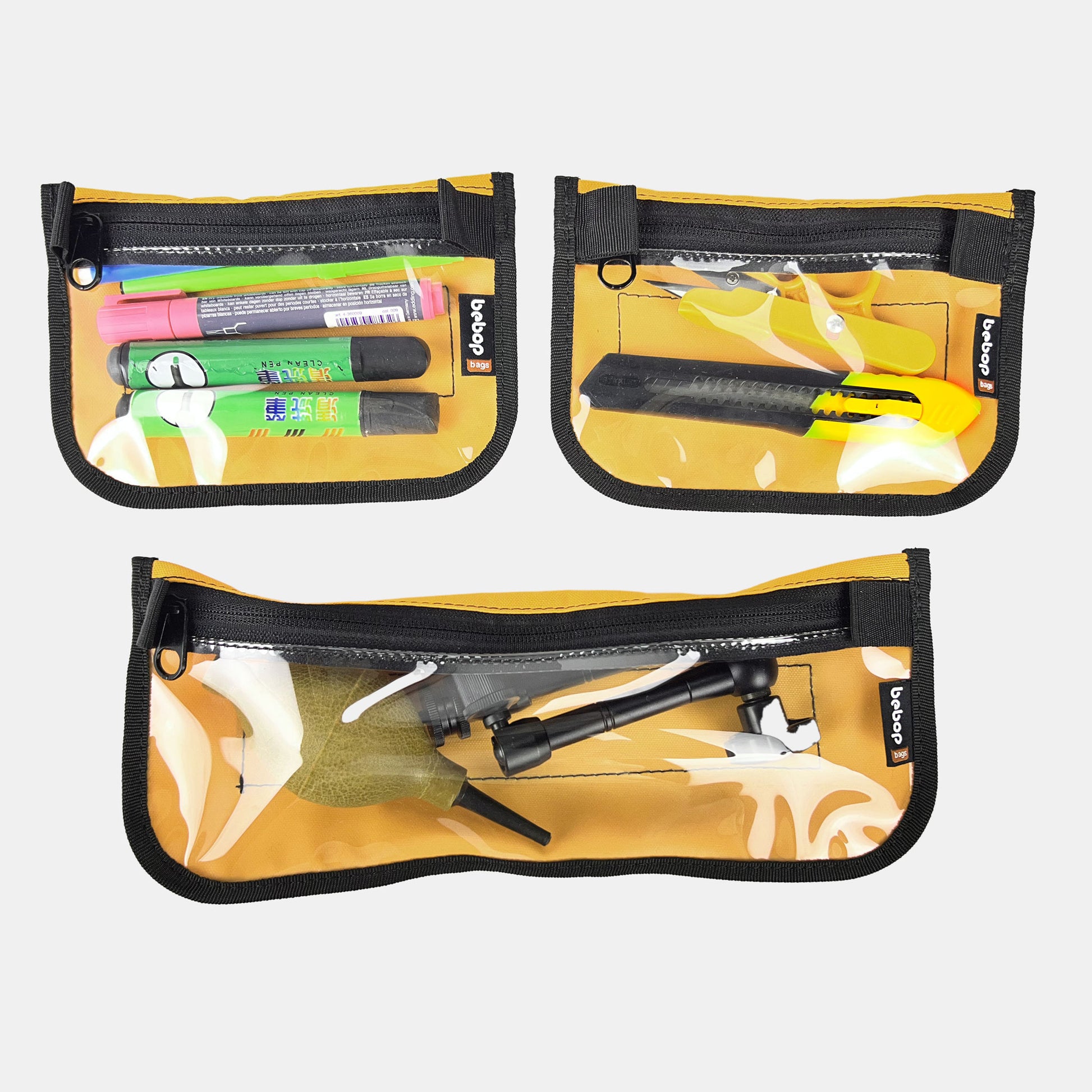 The bag comes with 2 dividers, 3 clear pvc pouches, an adjustable shoulder strap, 1 tape holder secured with buckle, 2 lid straps